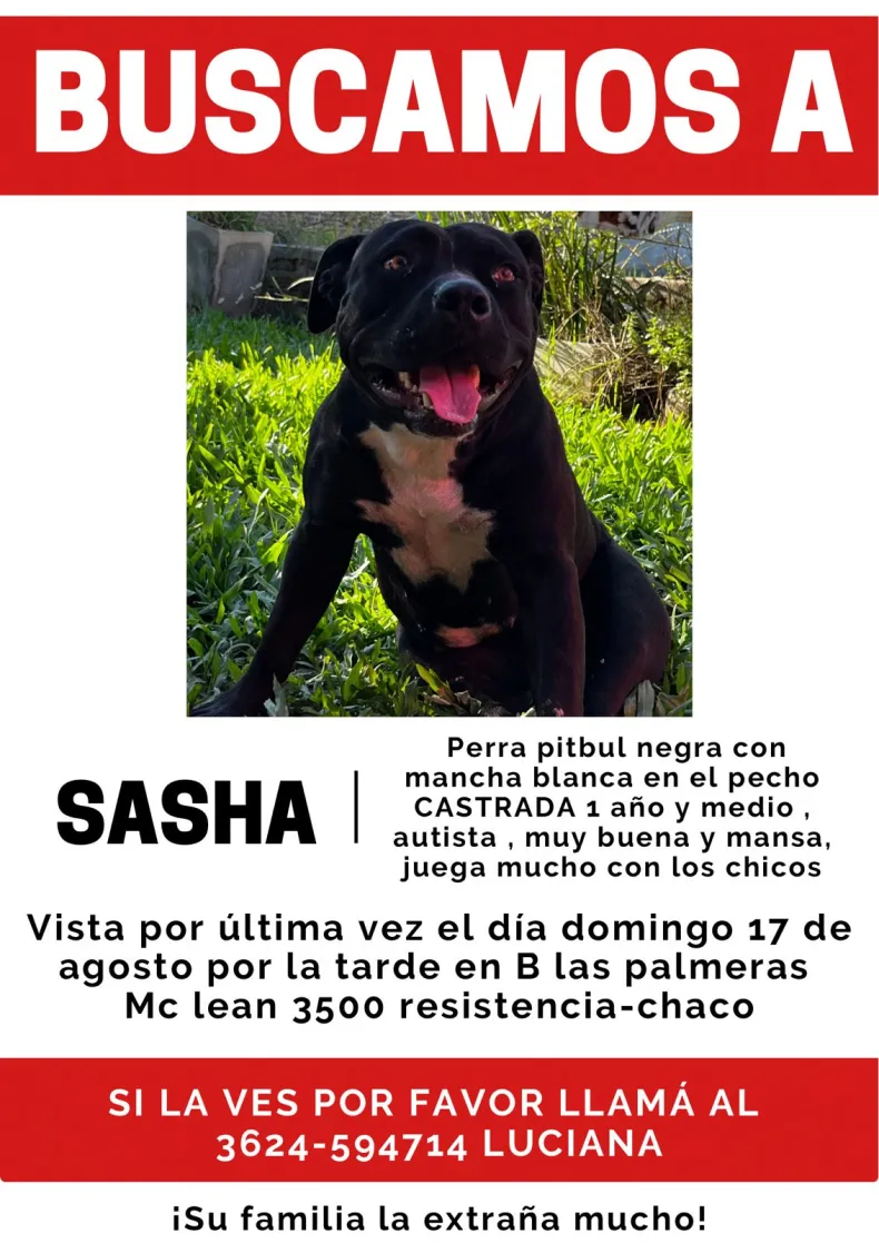 Sasha es una perra pitbull negra con una mancha blanca en el pecho. Tiene un año y medio, está castrada y, según su dueña, es "muy buena, mansa y juega mucho con los chicos". Fue vista por última vez el domingo 17 de agosto por la tarde en el barrio Las Palmeras, en la zona de calle Mc Lean al 3500, en Resistencia. Su familia pide información al 3624 594714.