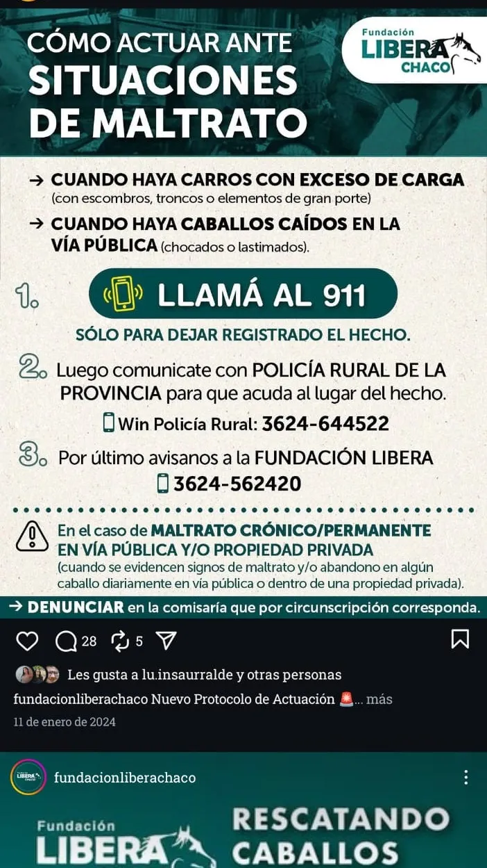 Desde la Fundación Libera Chaco difundieron un flyer en el que precisan cómo interceder en estos casos. Uno de ellos puede ser cuando un caballo es obligado a trasladar un carro con una carga excesiva o cuando se observe a un equino en la vía pública con señales de estar lesionado.