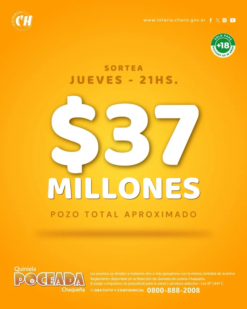 El próximo sorteo de la Poceada Chaqueña se realizará el jueves 28 de agosto a las 21:00, con un pozo estimado de $ 37.545.161,92.
