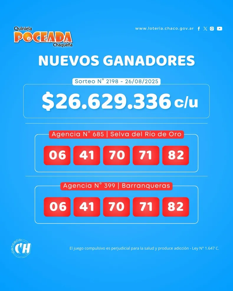 La suerte volvió a sonreír en la Quiniela Poceada Chaqueña. En el sorteo N° 2198, realizado este martes 26 de agosto de 2025, dos apostadores lograron acertar los cinco números y se consagraron ganadores de un pozo millonario.