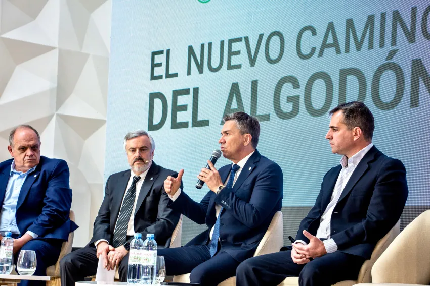El gobernador del Chaco, Leandro Zdero, encabezó este jueves en la Bolsa de Cereales de Buenos Aires la presentación del primer algodón argentino con tres eventos biotecnológicos, en el lanzamiento del evento "El nuevo camino del algodón".