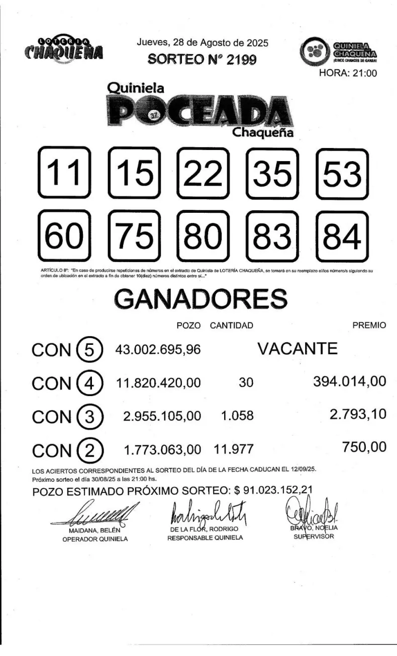 En el sorteo N° 2199 de la Quiniela Poceada Chaqueña, realizado este jueves 28 de agosto de 2025 a las 21, no hubo ganadores con cinco aciertos, por lo que el pozo mayor quedó vacante.