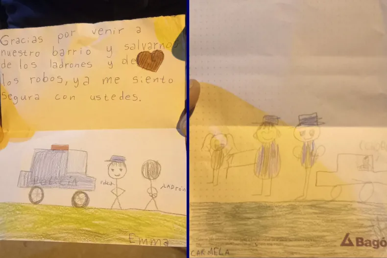Este viernes, cerca de las 23.30, los efectivos fueron sorprendidos gratamente por habitantes del barrio que salieron de sus casas para saludarlos. Además de las palabras de agradecimiento de los adultos, el momento más emotivo fue cuando un grupo de niños entregó cartas y dibujos realizados por ellos mismos y dedicados a los agentes como muestra de cariño y reconocimiento.