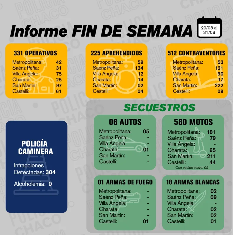 Durante el último fin de semana de agosto, la Policía del Chaco desplegó 331 operativos de control y prevención en distintas localidades de la provincia.