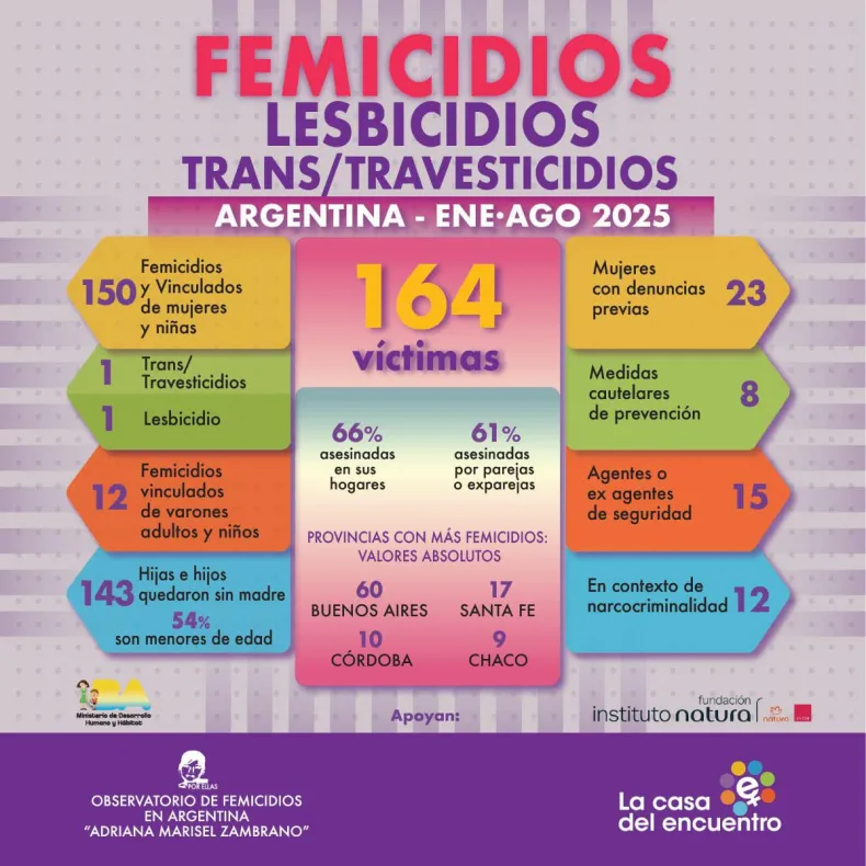 Desde el 1° de enero al 31 de agosto de 2025, en Argentina hubo 150 femicidios y vinculados de mujeres y niñas, 1 lesbicidio, 1 transfemicidio y 12 femicidios vinculados de varones adultos y niños. En total, hubo 164 víctimas.