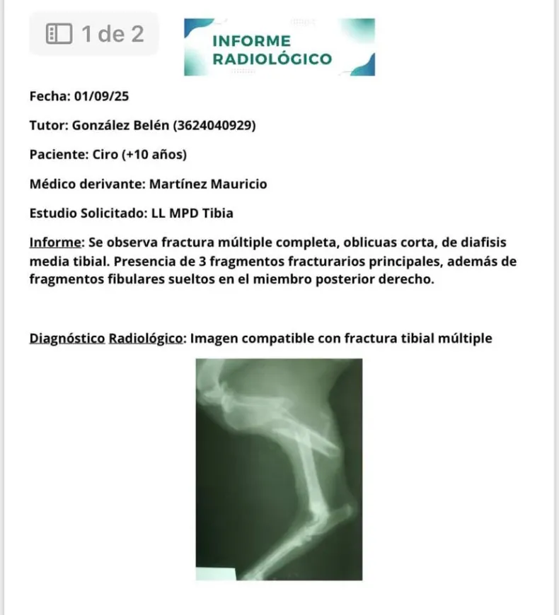 El animal fue atacado por otro perro y quedó con múltiples fracturas en su pata trasera. Necesita costear su atención médica y una importante cirugía.
