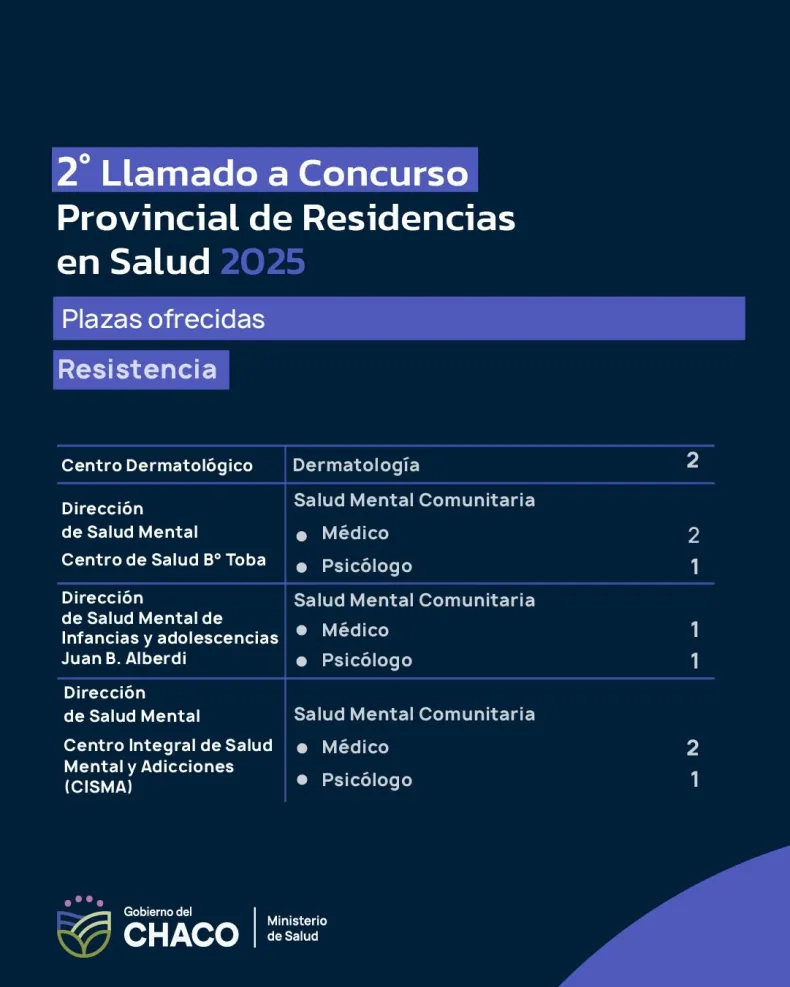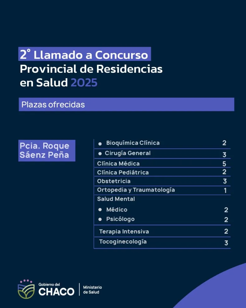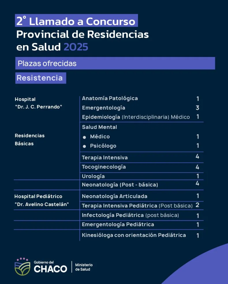 El Ministerio de Salud Pública del Chaco informó que se encuentran disponibles plazas para la realización de residencias en diferentes especialidades. La postulación se hace de forma digital.