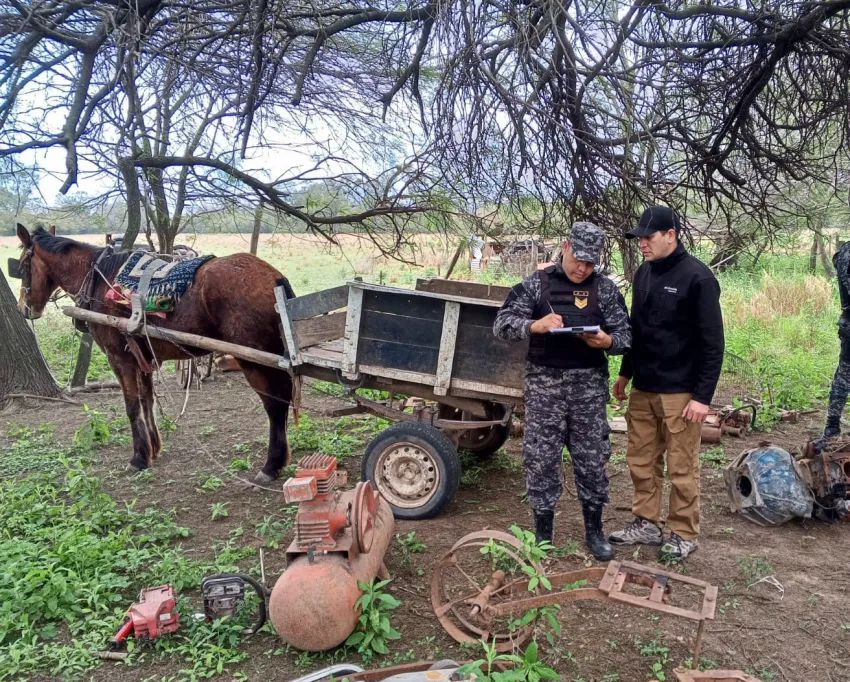En el lugar se secuestraron un carro de tracción a sangre, un caballo pelaje zaino, un motor Perkins, un compresor de 250 litros, herramientas agrícolas (arado y sembradora manual), una jaula, una morza, cables de aluminio, un carrito de transporte de motores y una sonda de perforación de hierro.
