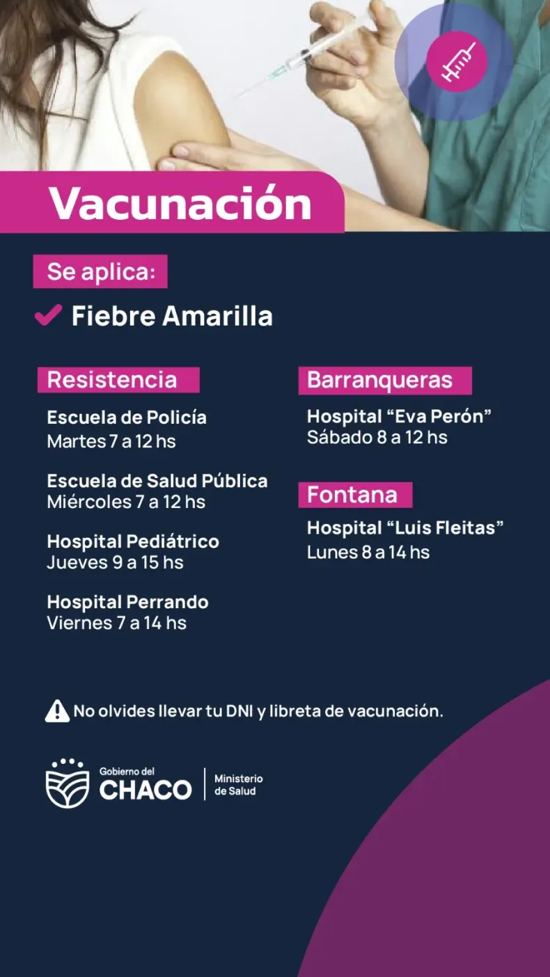 En lo que resta de este año, quienes quieran vacunarse deberán llevar DNI y libreta de vacunación y acercarse a las postas habilitadas. En Resistencia, en la Escuela de Policía (martes 7 a 12), en la Escuela de Salud Pública (miércoles 7 a 12), en el Hospital Pediátrico (jueves 9 a 15) y en el Hospital Perrando (viernes 7 a 14).