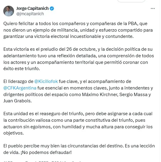 Jorge Capitanich, exgobernador de Chaco, realizó una serie de posteos tras las elecciones en la provincia de Buenos Aires de este domingo. A través de cálidos mensajes de apoyo y felicitaciones destacó la unidad de los "compañeros" por la "incuestionable y contundente victoria electoral".