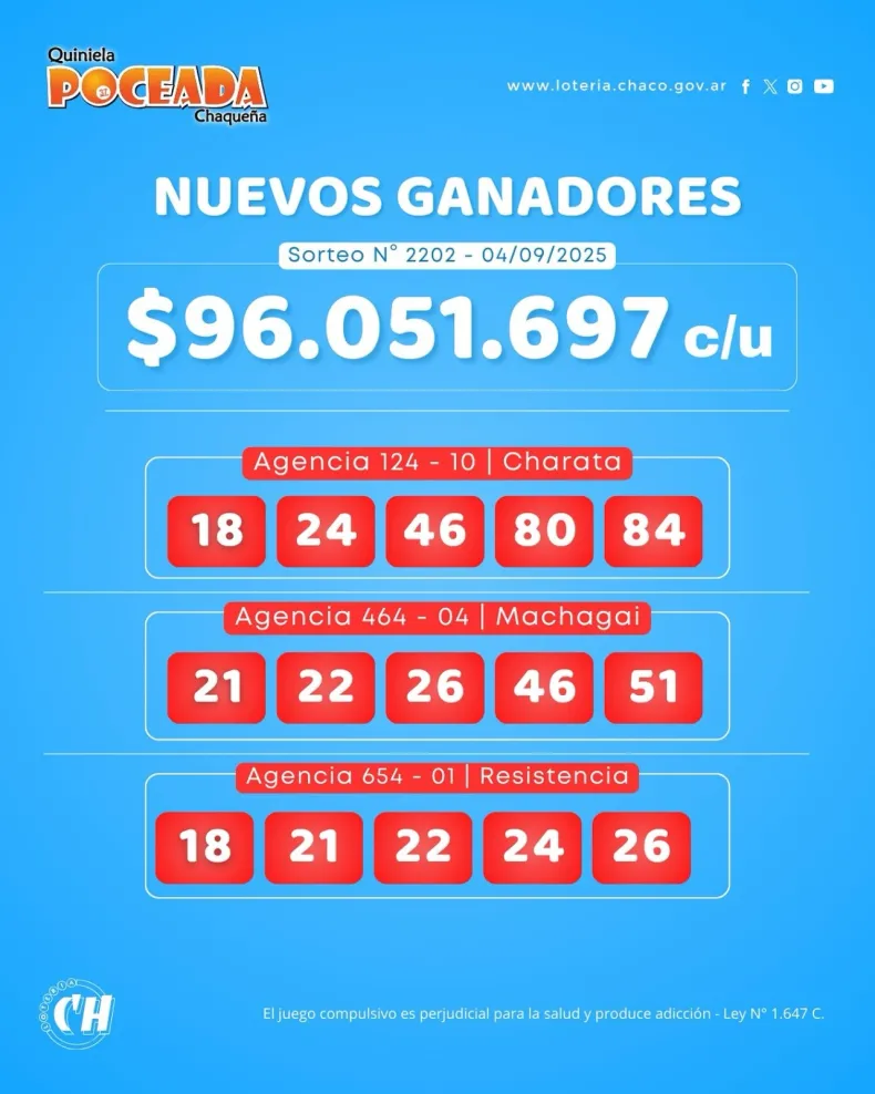 Vale recordar que el primer premio durante la edición del jueves 4 de septiembre fue compartido junto a otros dos ganadores, uno de Machagai y otro Resistencia, a quienes correspondió el mismo monto.