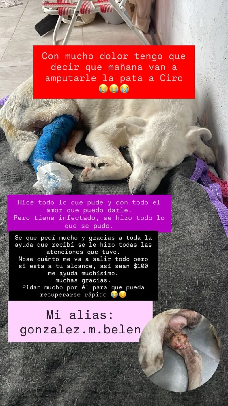 Sin embargo, el cuadro se complicó y este jueves se resolvió avanzar con la amputación. "Con mucho dolor tengo que contar que a Ciro le van a amputar la patita. Hice todo lo posible y le di todo el amor que pude, pero su pierna está muy infectada. Se intentó todo lo que estaba a nuestro alcance", expresó.