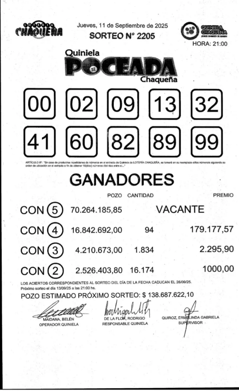 El sorteo N.º 2205 de la Quiniela Poceada Chaqueña, realizado este jueves 11 de septiembre a las 21 horas, no tuvo ganadores con cinco aciertos y el pozo principal quedó vacante.
