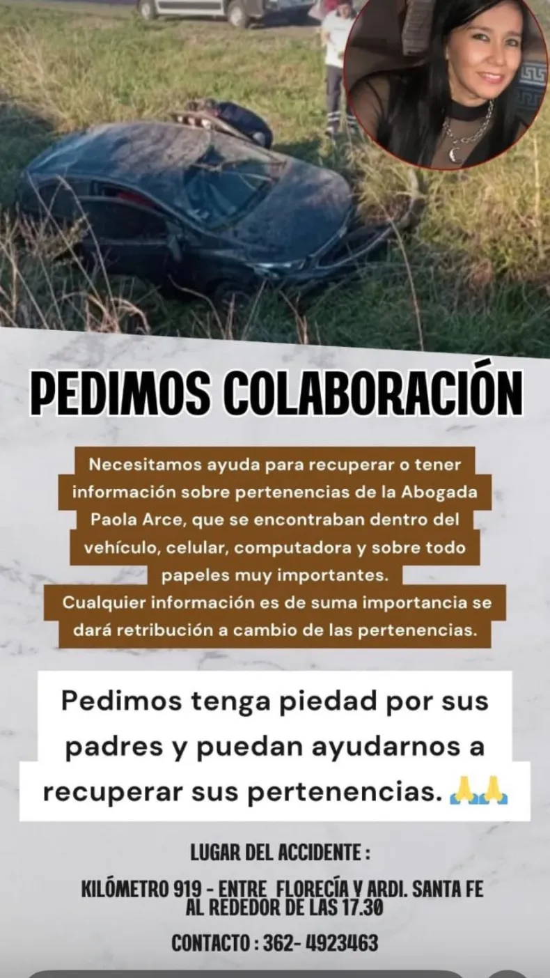 El pasado jueves por la tarde, Paola Arce murió en la Ruta Nacional 11 después de volcar con su auto en el kilómetro 919 cerca de Florencia. Días después, su familia reclama recibir las pertenencias de la mujer que quedaron dentro del auto.