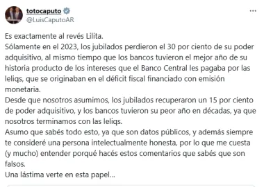 Frente a ello, el ministro salió en defensa de la gestión. "En el 2023, los jubilados perdieron el 30 por ciento de su poder adquisitivo, al mismo tiempo que los bancos tuvieron el mejor año de su historia producto de los intereses que el Banco Central les pagaba por las leliqs, que se originaban en el déficit fiscal financiado con emisión monetaria", señaló en el texto publicado en su perfil de "X", @LuisCaputoAR.