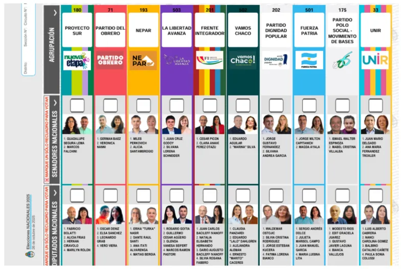 En el caso del Chaco, la boleta cuenta con 10 columnas por las agrupaciones participantes y dos filas horizontales donde se visualizan los candidatos, una de la categoría de Diputados Nacionales y otra para quienes se postulan a Senadores.
