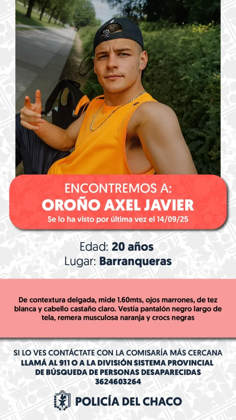 "Ese día salió con el juego de mate, a tomar mate con una amiga, que según la amiga nunca llegó", dijeron allegados de Axel Javier Oroño sobre la última vez que lo vieron. El joven de 20 años salió de su casa el pasado domingo 14 de septiembre y no volvió. Es buscado intensamente.