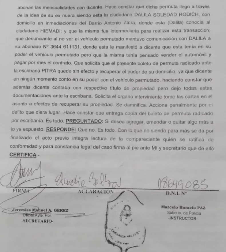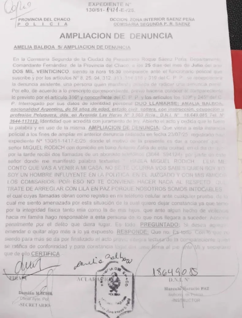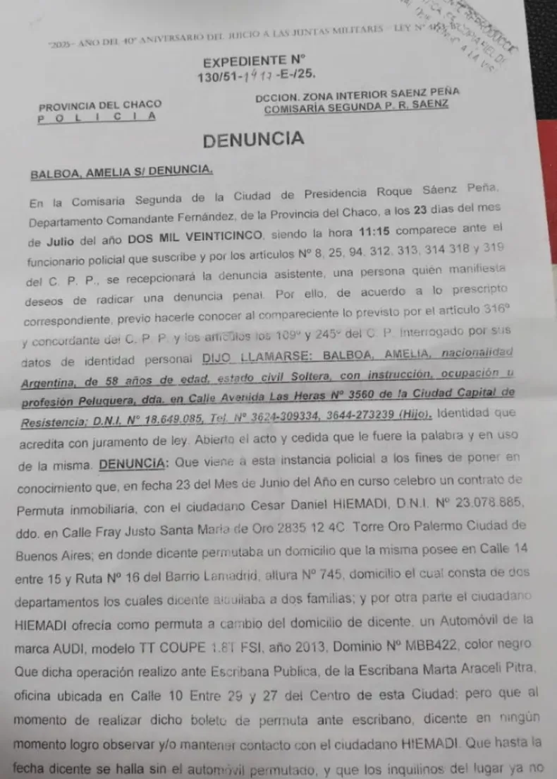 Amelia Balboa acusó a su exnuera, Dalila Rodich, y a su padre, Miguel Rodich, por una presunta estafa en la venta de su vivienda en Sáenz Peña. La mujer aseguró que también recibió amenazas.
