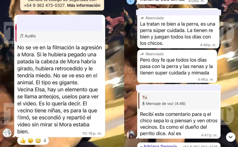 Vecinos de Villa San Martín compartieron en un grupo de WhatsApp su respaldo al cuidado de Mora: "La tienen re bien, es una perra super cuidada, la tratan re bien y juegan todos los días con los chicos", otro de los mensajes decía: "Doy fe que todos los días pasea con la perra y las nenas y la tienen super cuidada y mimada".