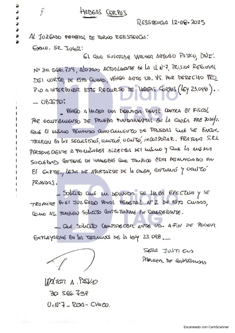 El 12 de agosto, Walter Pasko había presentado un pedido de hábeas corpus denunciando al fiscal Patricio Sabadini por presunto ocultamiento de pruebas y pidió que lo aparten de la causa. Ese pedido fue rechazado por la Cámara Federal de Apelaciones de Resistencia por considerar que no era la vía adecuada para el planteo.
