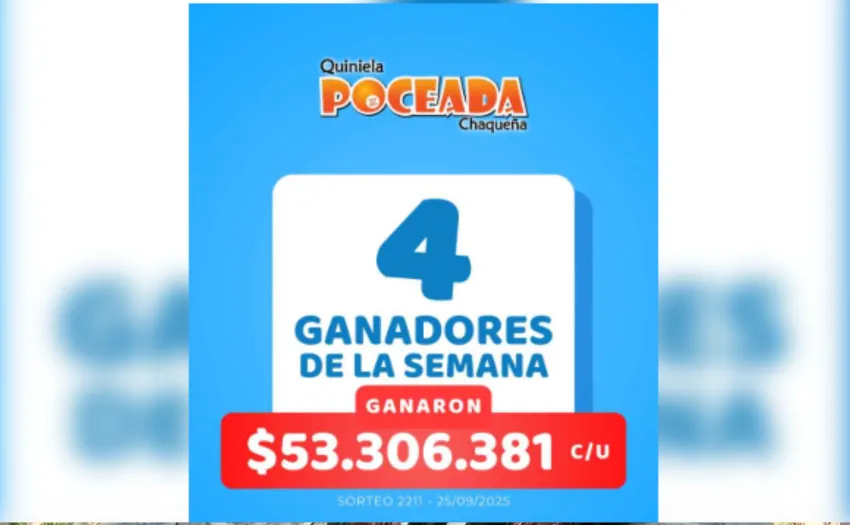 En el sorteo N° 2211 de la Quiniela Poceada Chaqueña, realizado el jueves 25 de septiembre, cuatro apostadores se consagraron ganadores y compartieron un pozo total de $ 211 millones de pesos, llevándose más de $ 53 millones cada uno.