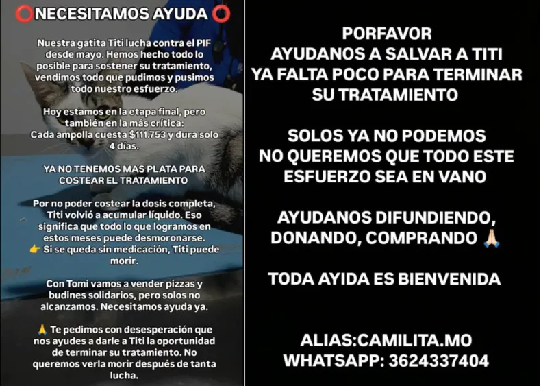 Además, detallaron que la medicación que requiere es muy costosa: "Cada ampolla vale $111.753 y dura solo cuatro días", señalaron. En este marco, piden la colaboración de la gente, ya que se les acaban los recursos para mantener este tratamiento y, de cortarse la vida de Titi, corre riesgo.
