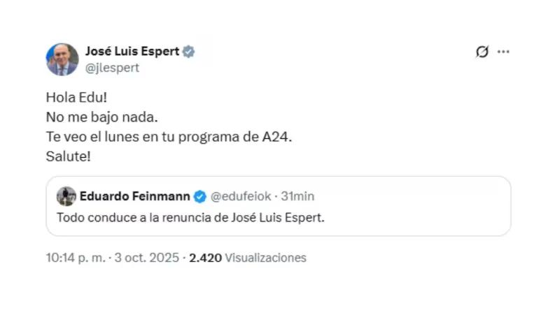 "Hola Edu! No me bajo nada. Te veo el lunes en tu programa de A24. Salute!", publicó Espert en su cuenta de "X", en respuesta al mensaje que Eduardo Feinmann había difundido minutos antes. En su posteo, el periodista sostuvo: "Todo conduce a la renuncia de José Luis Espert".