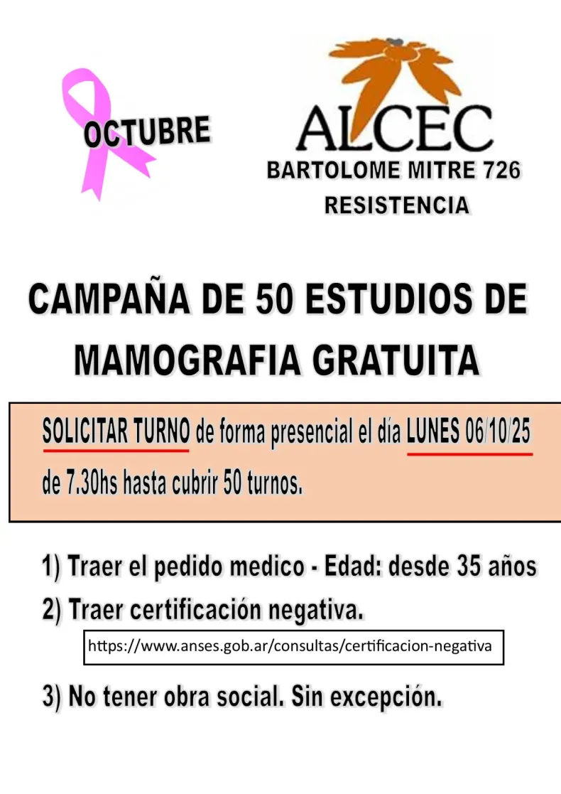En este marco, ALCEC lanzó una nueva campaña para la realización de 50 mamografías gratuitas. Para quienes quieran acceder, deben acercarse a la sede ubicada en Mitre 726 este próximo lunes 6 de octubre desde las 7.30 para solicitar un turno de forma presencial. Se recibirán pacientes desde ese horario y hasta agotar los cupos habilitados.