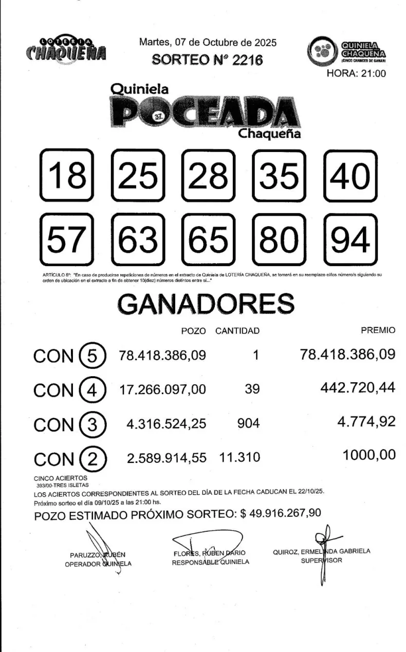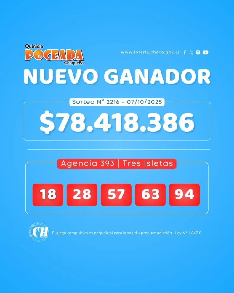 En el sorteo N° 2216 de la Quiniela Poceada Chaqueña, realizado el martes 7 de octubre de 2025, un apostador de Tres Isletas se llevó el pozo mayor de $ 78.418.386,09 al acertar los cinco números sorteados.