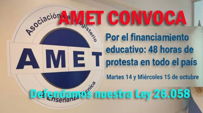 Desde AMET Nacional convocan a una doble jornada de protesta nacional por el financiamiento de la educación pública. La medida de fuerza iniciará el martes 14 de octubre con un paro de 24 horas, mientras que el 15, se llevará a cabo una "jornada de esclarecimiento público". Estas protestas serán acompañadas por una marcha nacional, "todo en defensa de las leyes que garantizan el financiamiento educativo", manifestaron.