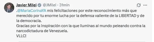 "Mis felicitaciones por este reconocimiento, más que merecido por tu enorme lucha por la defensa valiente de la libertad y de la democracia", expresó Milei en sus redes sociales. Además agregó: "Gracias por la inspiración con la que iluminas al mundo peleando contra la narcodictadura de Venezuela".