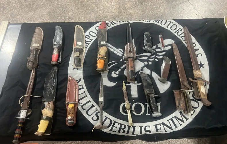 En su poder llevaba un ventilador plástico, una bolsa con cables, discos diamantados, navajas y una gran cantidad de cuchillos tipo caza y facones, muchos de ellos con inscripciones extranjeras y fundas de cuero o cuerina. Entre los elementos incautados destacaron un machete de artillería argentino modelo 1909, con grabado de fábrica alemana, y una bayoneta rusa de 35 centímetros.
