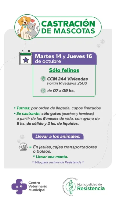 Puntualmente en los operativos, los turnos son limitados y se brindan por orden de llegada. El próximo será el jueves 16, de 7 a 9, y se llevará adelante nuevamente en el CCM del barrio 244 Viviendas ante el alto nivel de demanda. Se atenderán solo felinos, machos y hembras.