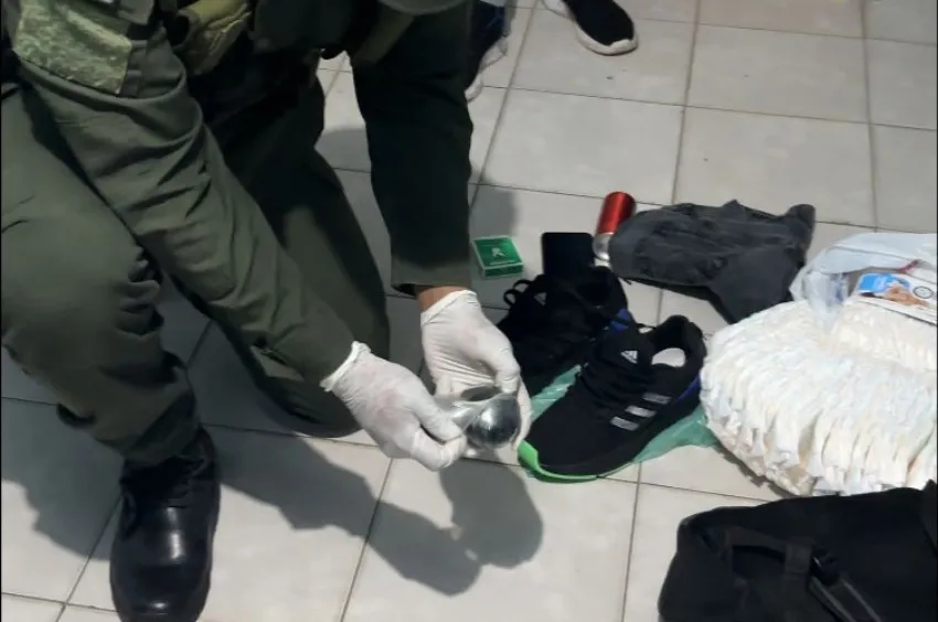 Al revisar su mochila, hallaron un envoltorio de nylon negro escondido dentro de una zapatilla. La sustancia fue sometida a una prueba de campo narcotest, que arrojó resultado positivo para clorhidrato de cocaína, con un peso total de 100,7 gramos.