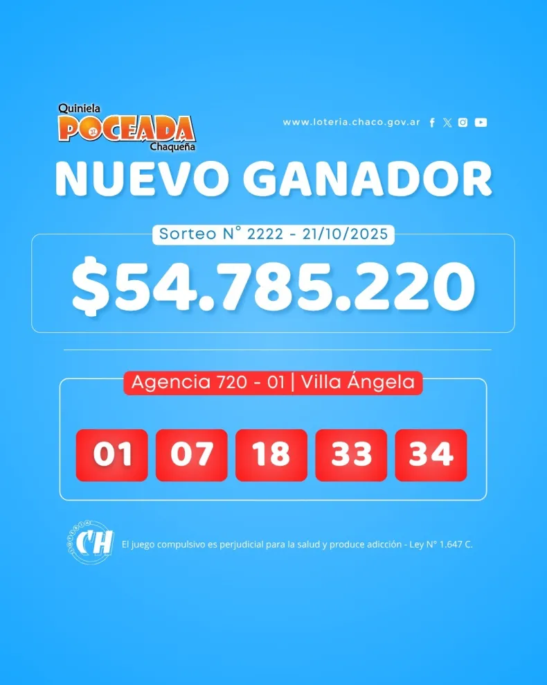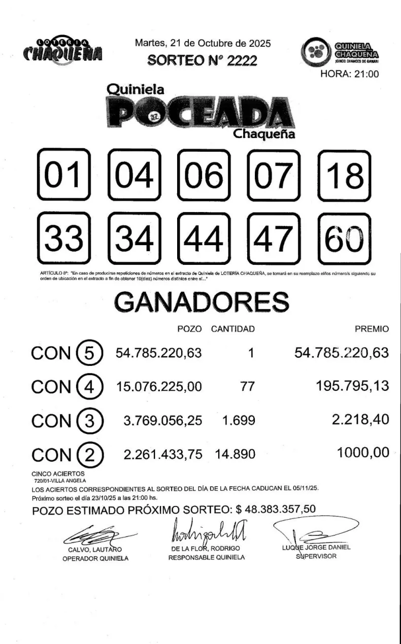 Este martes 21 de octubre se realizó el sorteo N° 2222 de la Quiniela Poceada Chaqueña a las 21:00 horas. Los números favorecidos fueron: 01, 04, 06, 07, 18, 33, 34, 44, 47 y 60.