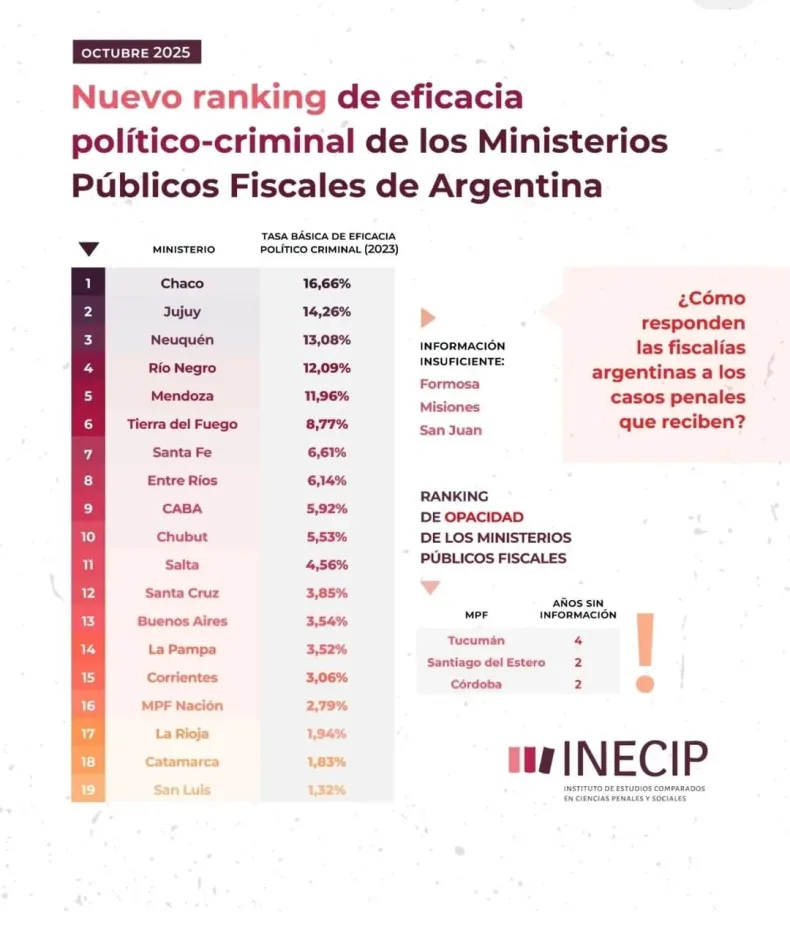 "El ranking se basa en la tasa básica de eficacia político-criminal, que mide cuántos casos penales que ingresan a un Ministerio Público Fiscal reciben una respuesta de calidad, aunque sea mínima o potencial, es decir, condenas, suspensiones de juicio a prueba o acuerdos reparatorios de cualquier tipo", detallaron desde el organismo.
