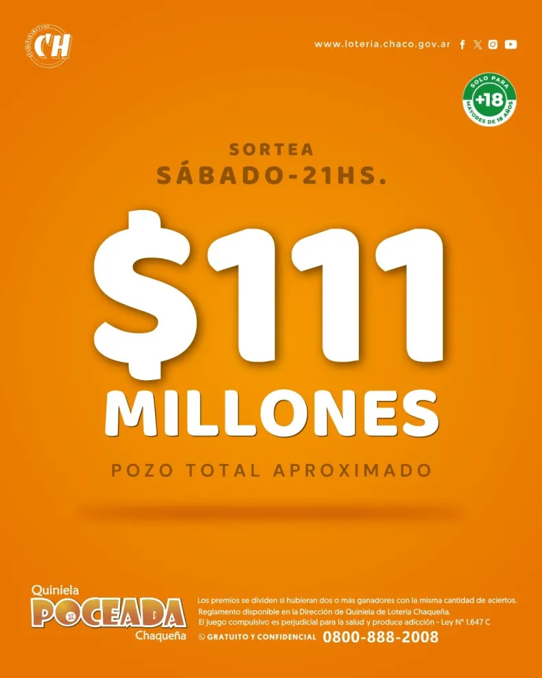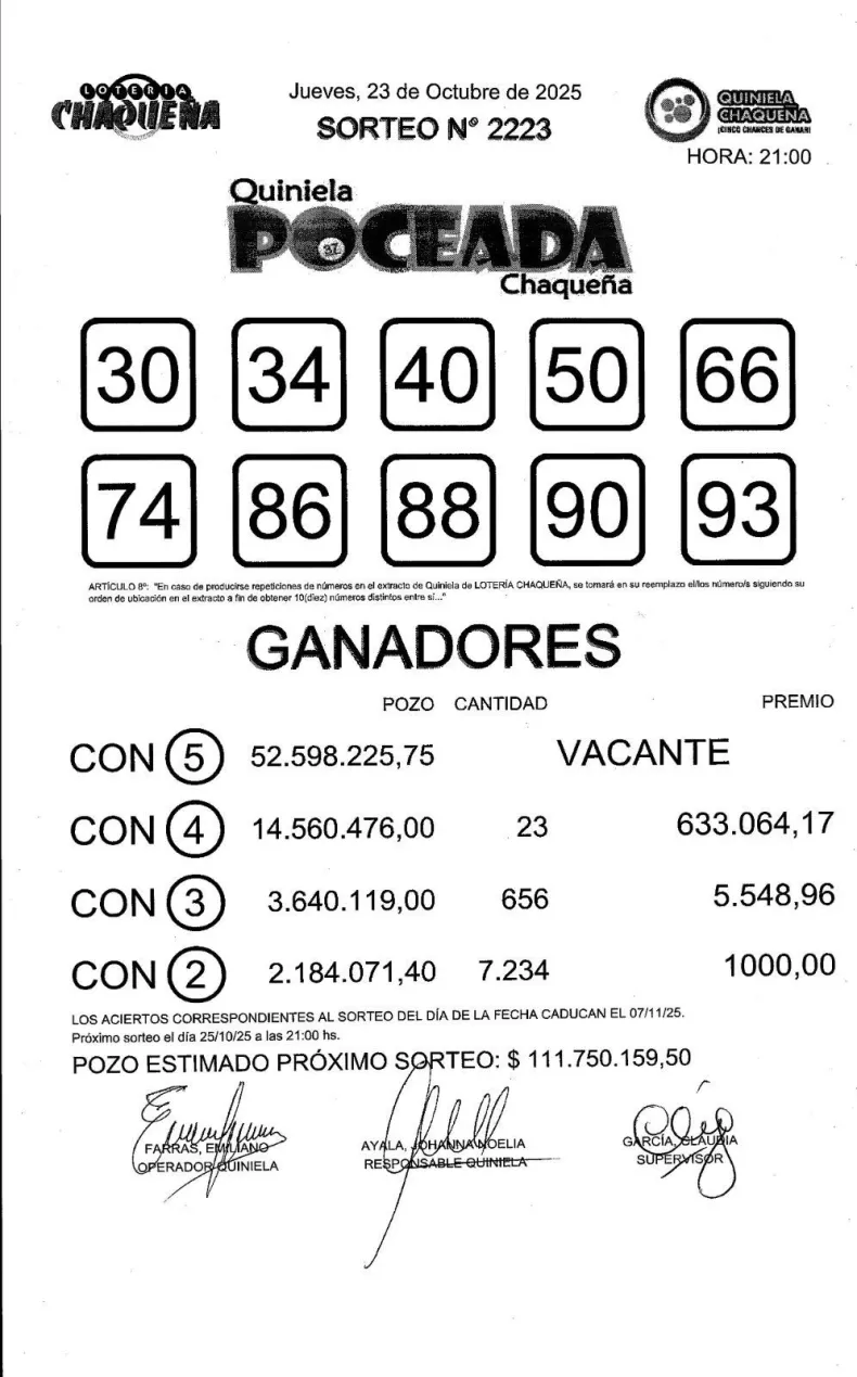 En el sorteo N° 2223 de la Quiniela Poceada Chaqueña, realizado este jueves 23 de octubre de 2025 a las 21:00, no hubo ganadores con cinco aciertos, por lo que el pozo mayor de $ 52.598.225,75 quedó vacante.