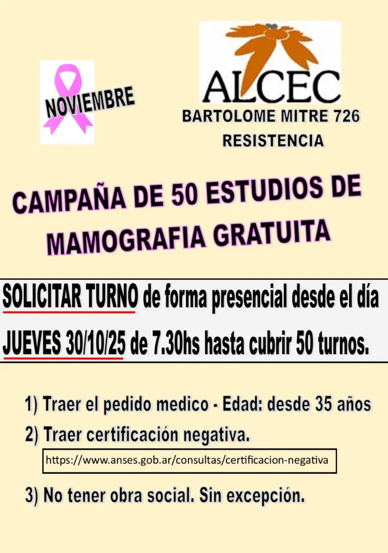 La Asociación de Lucha contra el Cáncer en Resistencia (ALCEC) lanzó una nueva campaña de mamografías gratuitas en el marco del mes de prevención y concientización contra el cáncer de mama. Los turnos serán otorgados el próximo jueves 30 de octubre.