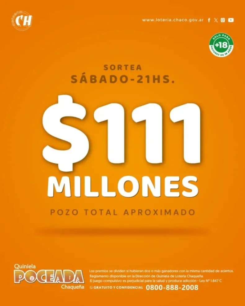 Este sábado 25 de octubre, a las 21:00, se realizará un nuevo sorteo de la Quiniela Poceada Chaqueña, con un pozo estimado superior a los $111 millones, luego de que el premio mayor quedara vacante en la edición del jueves.