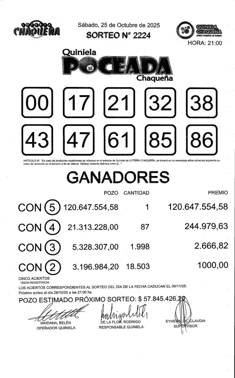Según informó Lotería Chaqueña, en esta edición hubo un solo ganador con cinco aciertos, mientras que 87 apostadores obtuvieron cuatro aciertos y recibirán $ 244.979,63 cada uno. Además, 1.998 personas ganaron con tres aciertos y 18.503 con dos, llevándose $ 2.666,82 y $ 1.000, respectivamente.