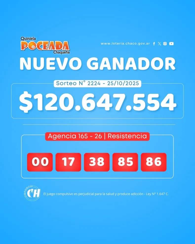 Un apostador de Resistencia se convirtió en el flamante ganador del sorteo N° 2224 de la Quiniela Poceada, realizado este sábado 25 de octubre de 2025. El afortunado acertó los cinco números del extracto y se llevó un premio de $ 120.647.554,58.