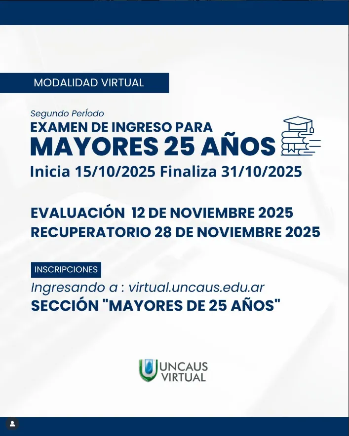 La Universidad Nacional del Chaco Austral (UNCAUS) a través de Secretaría Académica, informa que se encuentran abiertas las inscripciones hasta el 31 de octubre de 2025, para aquellas personas mayores de 25 años que no poseen título de nivel secundario y que deseen estudiar una carrera presencial o a distancia en la institución, en el Ciclo Lectivo 2026.