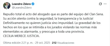 En el texto, difundido en sus redes sociales, continúa diciendo: "La gravedad de los hechos en los que se intimida a los jurados violando las normas más elementales es alarmante, y preocupa a toda una provincia. CECILIA MERECE JUSTICIA".