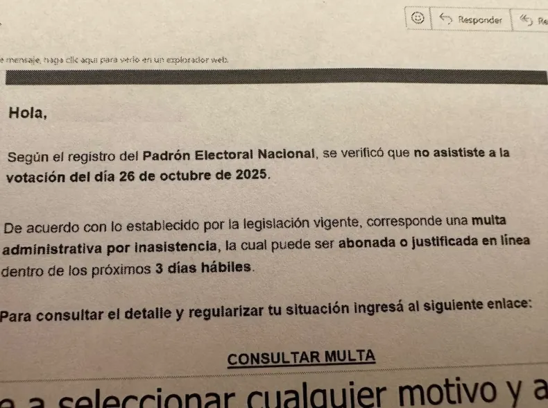El texto del correo falso advierte falsamente que el ciudadano dispone de "tres días hábiles" para abonar o justificar la inasistencia, buscando generar urgencia y confusión. Las autoridades recordaron que toda gestión relacionada con el registro de infractores debe realizarse únicamente a través del sitio oficial, y recomendaron no abrir ni reenviar correos sospechosos.