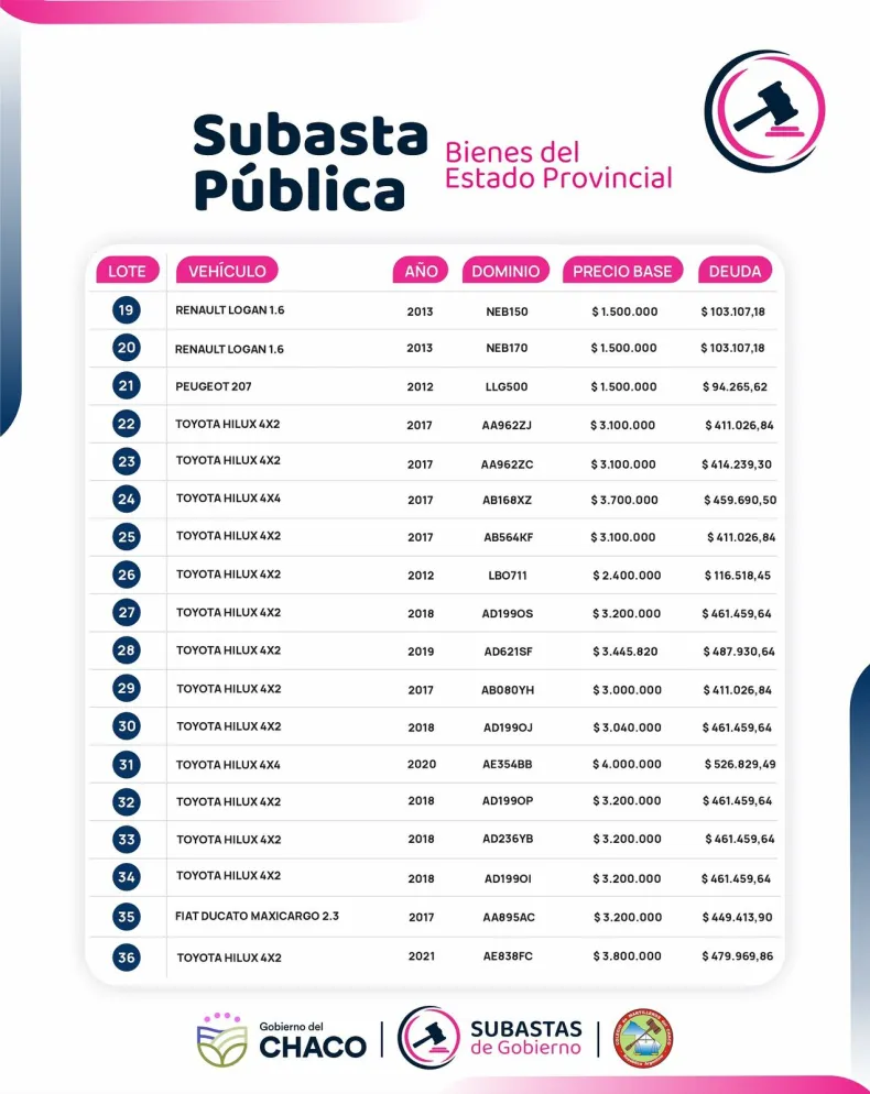 El Chaco subastará 36 vehículos oficiales el 14 de noviembre en Resistencia