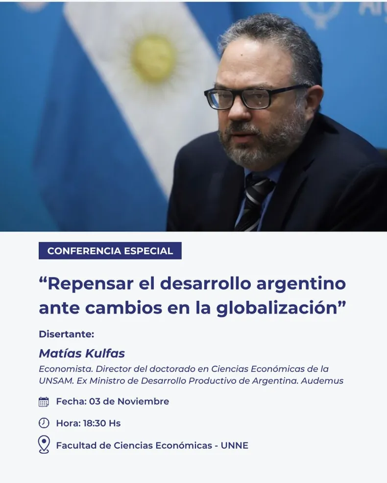 Es preciso resaltar que, a las 18.30, Matías Kulfas brindará una conferencia titulada "Repensar el desarrollo argentino ante cambios en la globalización", en el marco de la presentación de su nuevo libro. Para inscribirse, los asistentes deben completar el siguiente formulario: https://docs.google.com/forms/d/1822qbwgePZQARw3Yd-TXbXgHnW0vSS8GsI7-3a_QRjE/viewform?edit_requested=true.