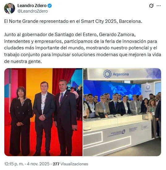 En sus redes sociales, Zdero resumió la jornada: "El Norte Grande representado en el Smart City 2025, Barcelona. Junto al gobernador de Santiago del Estero, Gerardo Zamora, intendentes y empresarios, participamos de la feria de innovación para ciudades más importante del mundo, mostrando nuestro potencial y el trabajo conjunto para impulsar soluciones modernas que mejoren la vida de nuestra gente".