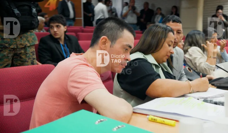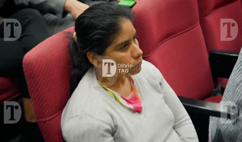 Dentro de la sala, nuevamente se observó a Emerenciano Sena cubriéndose el rostro, a César Sena con una chomba gris y sin barbijo, y a Marcela Acuña rezando mientras seguía la lectura.