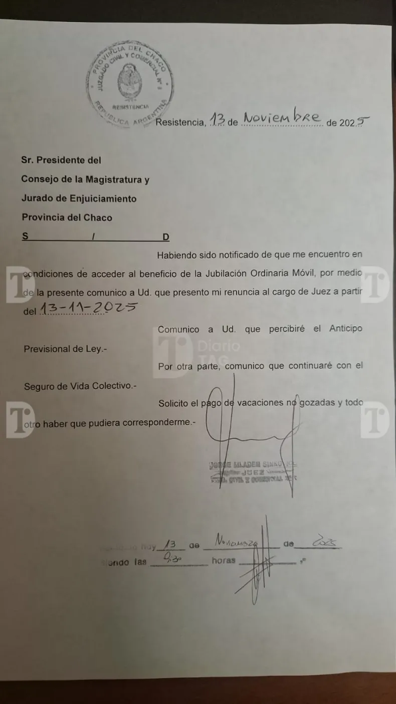 En su nota de renuncia, Sinkovich informó que se acogerá a la jubilación ordinaria y reclamó el pago del anticipo previsional, las vacaciones no gozadas y otros haberes pendientes. El trámite quedó ahora en manos del Superior Tribunal de Justicia, que deberá definir si acepta o no la dimisión.