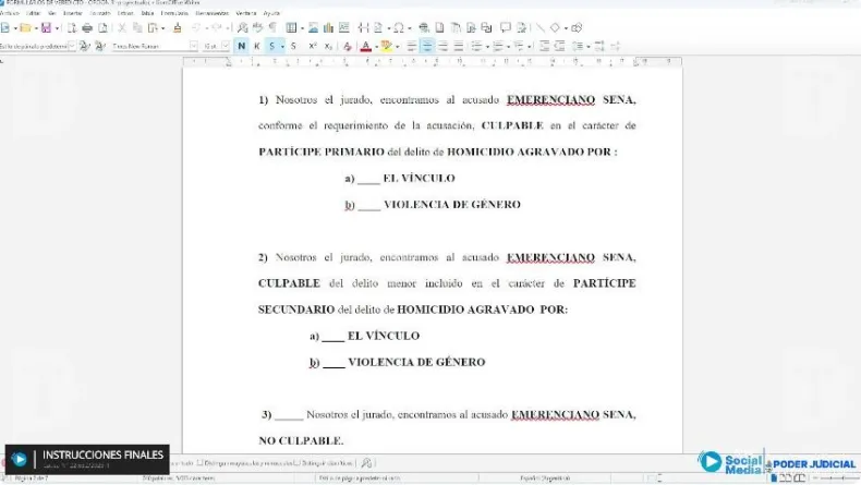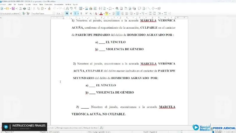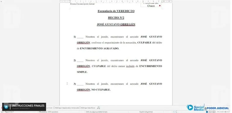 El jurado recibirá siete formularios de veredicto, uno por cada imputado. Cada formulario incluirá varias opciones posibles, y la magistrada les indicará cómo deben completarlos correctamente.